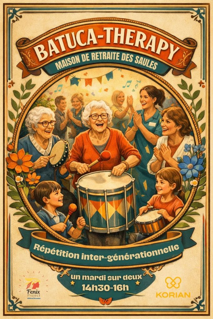 La Batuc’Korian a officiellement vu le jour à la maison de retraite des Saules, et quelle belle énergie dès le départ ! Résident·e·s, soignant·e·s et famille se sont retrouvé·e·s autour des percussions pour partager un moment de jeu, de convivialité et de joie collective.