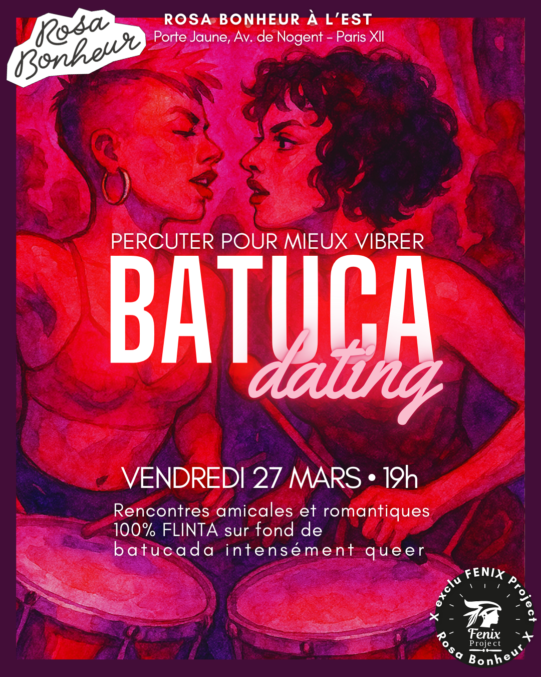 À l’occasion du printemps, FENIX Project lance son premier stage de batucada ! 🔥 Du 13 au 17 avril, sous la direction musicale de Julie Nauthonier et l’accompagnement des super-bénévoles FENIX, nous vous proposons de rejoindre votre propre batucada militante. L’objectif ? Participer à sa création de A à Z, du premier échauffement au show final en jouant pour le concert de cloture du festival Live for Good aux côtés des femmes du SAMU Social, partenaire du FENIX Project. 💜